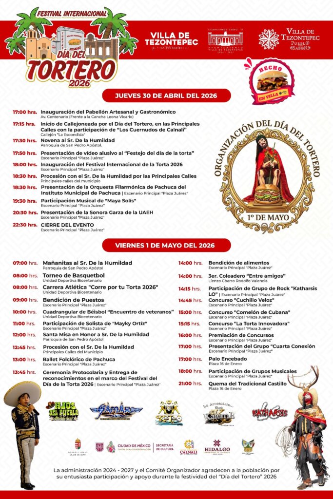 Villa de Tezontepec se alista para vivir una de sus celebraciones más emblemáticas con la edición 2026 del Festival Internacional de la Torta, que se llevará a cabo los días 30 de abril y 1 de mayo, en honor al Señor de la Humildad.